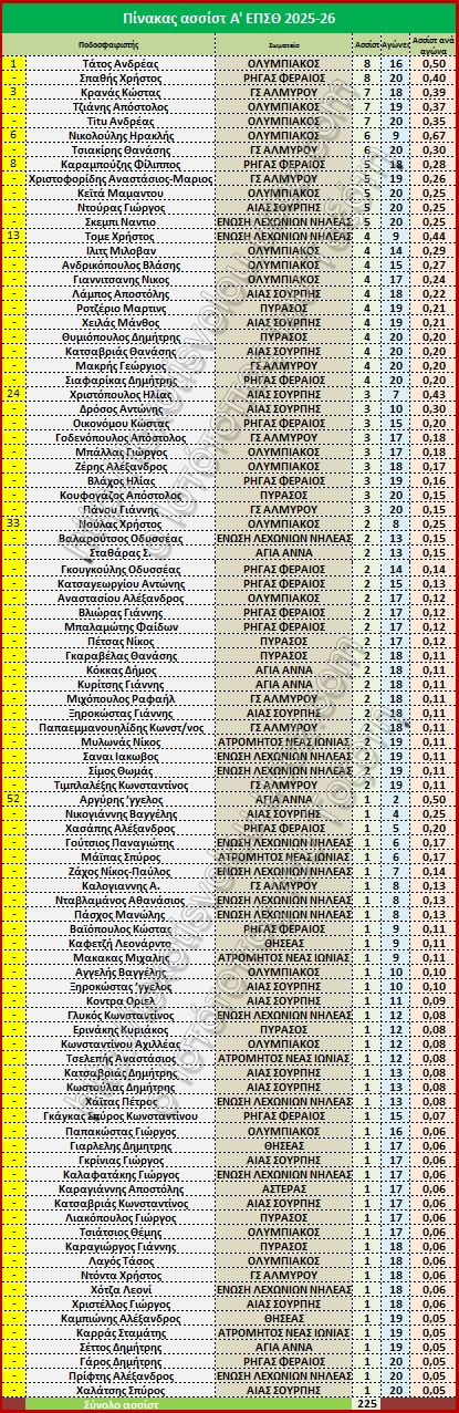 Πίνακας ασσίστ Α' ΕΠΣΘ 2025-26
