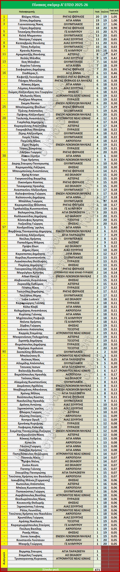 » Πίνακας σκόρερ Α' ΕΠΣΘ 2025-26