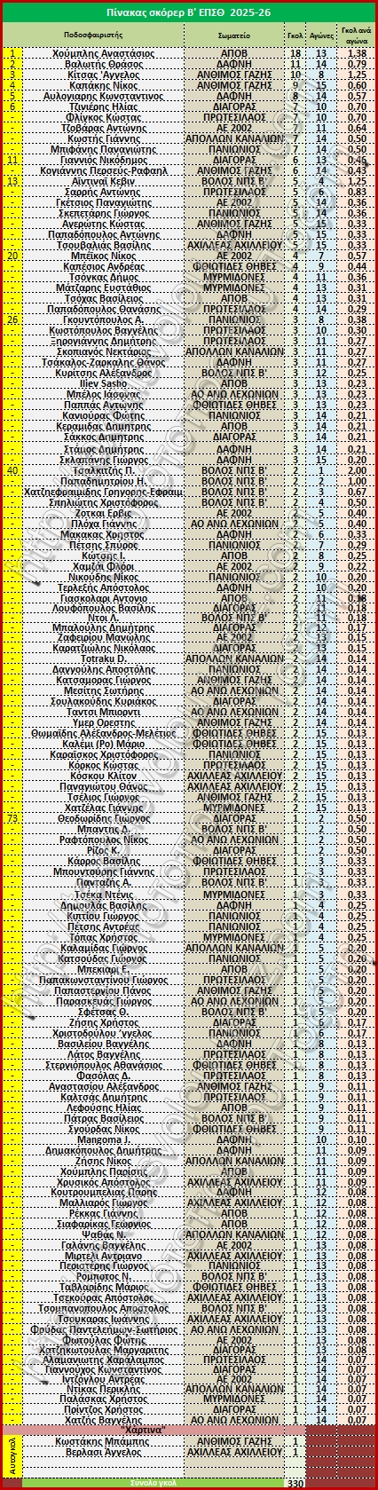 Πίνακας σκόρερ Β' ΕΠΣΘ 2025-26