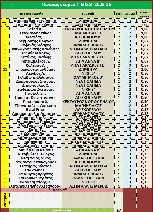Πίνακας σκόρερ Γ' ΕΠΣΘ 2025-26