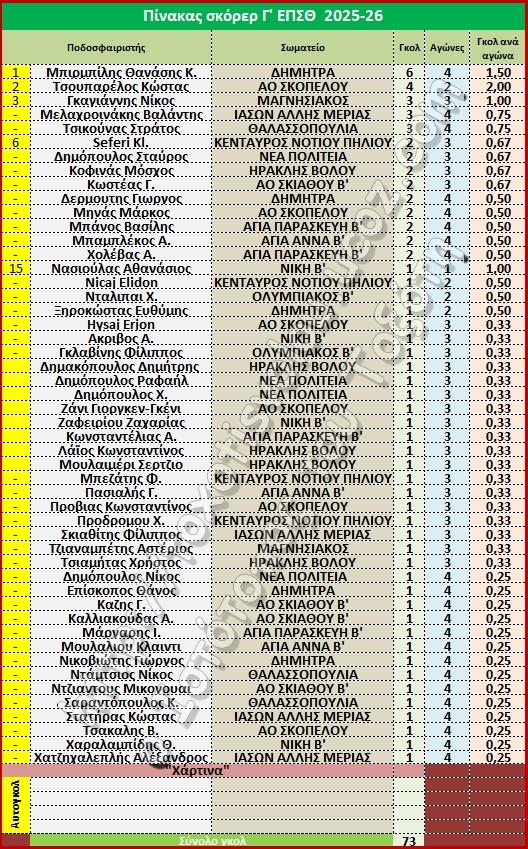 Πίνακας σκόρερ Γ' ΕΠΣΘ 2025-26