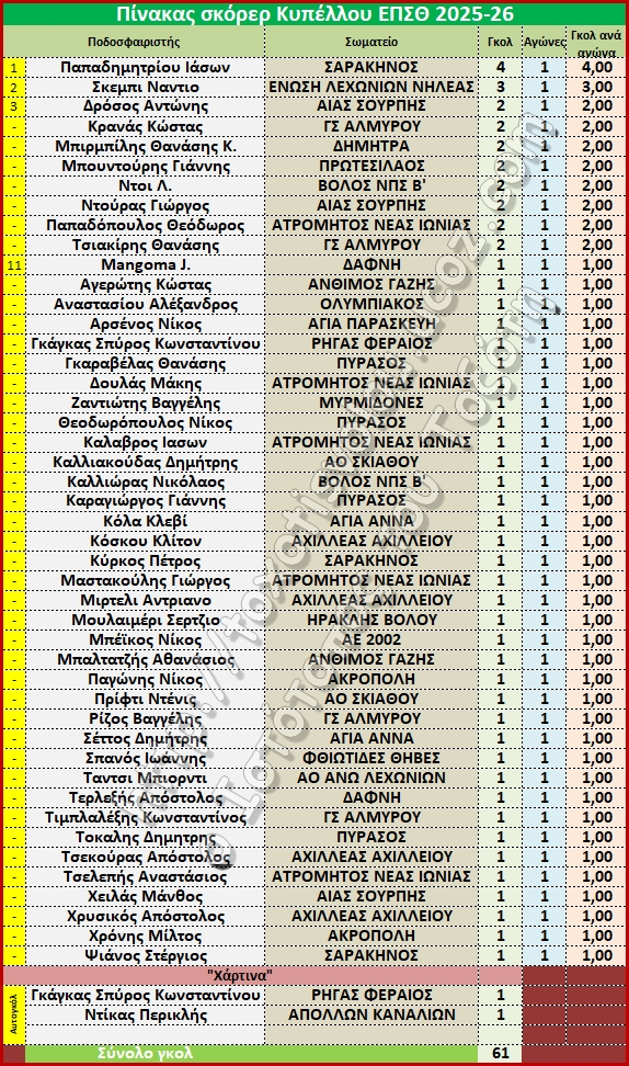 » Πίνακας σκόρερ Κυπέλλου ΕΠΣΘ 2025-26